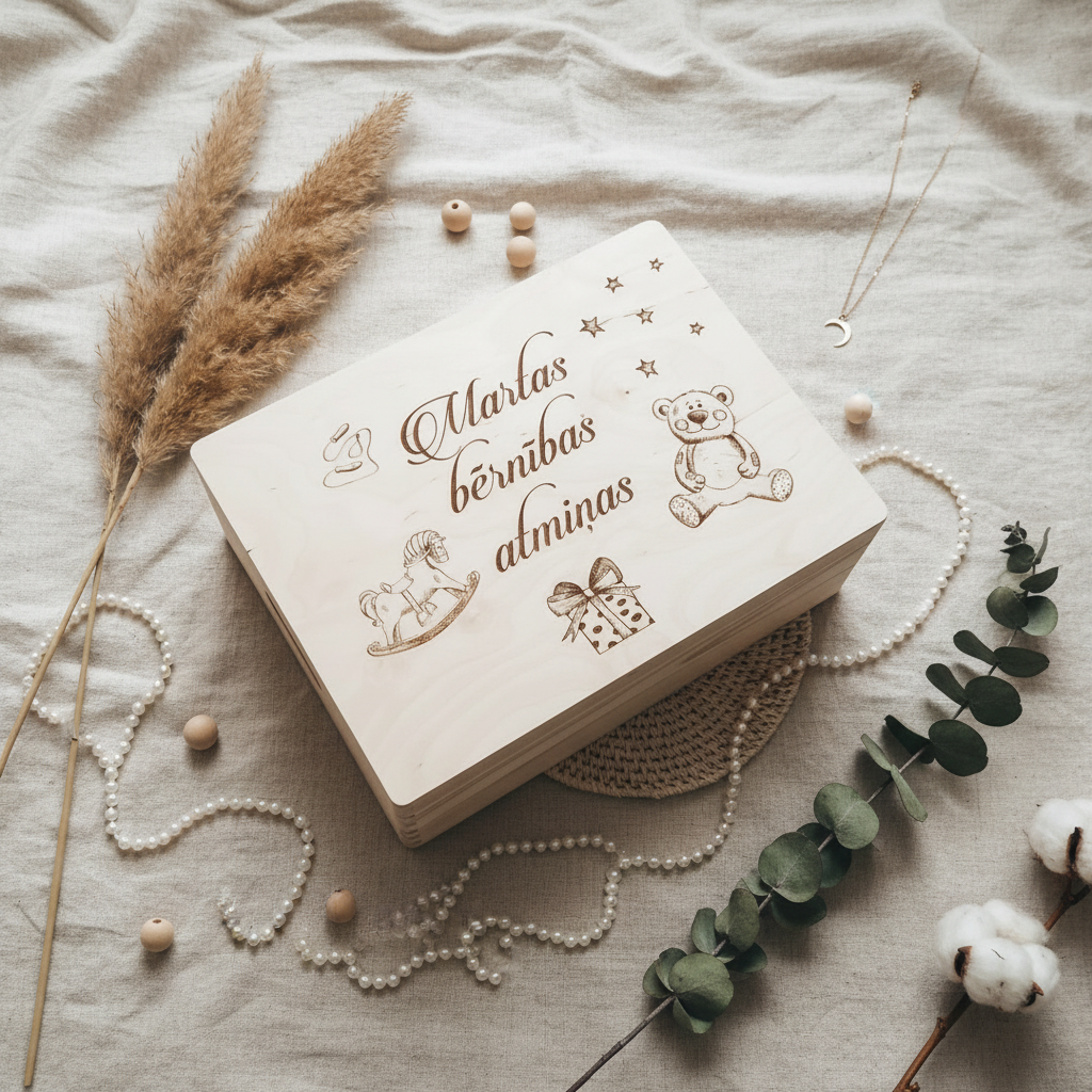 Koka lādīte ar gravējumu būs noderīga un sirsnīga dāvana kā lieliem, tā maziem, īpaša vieta, kur glabāt dažādus bērnības nieciņus, mīļlietiņas un citus svarīgus dārgumus.