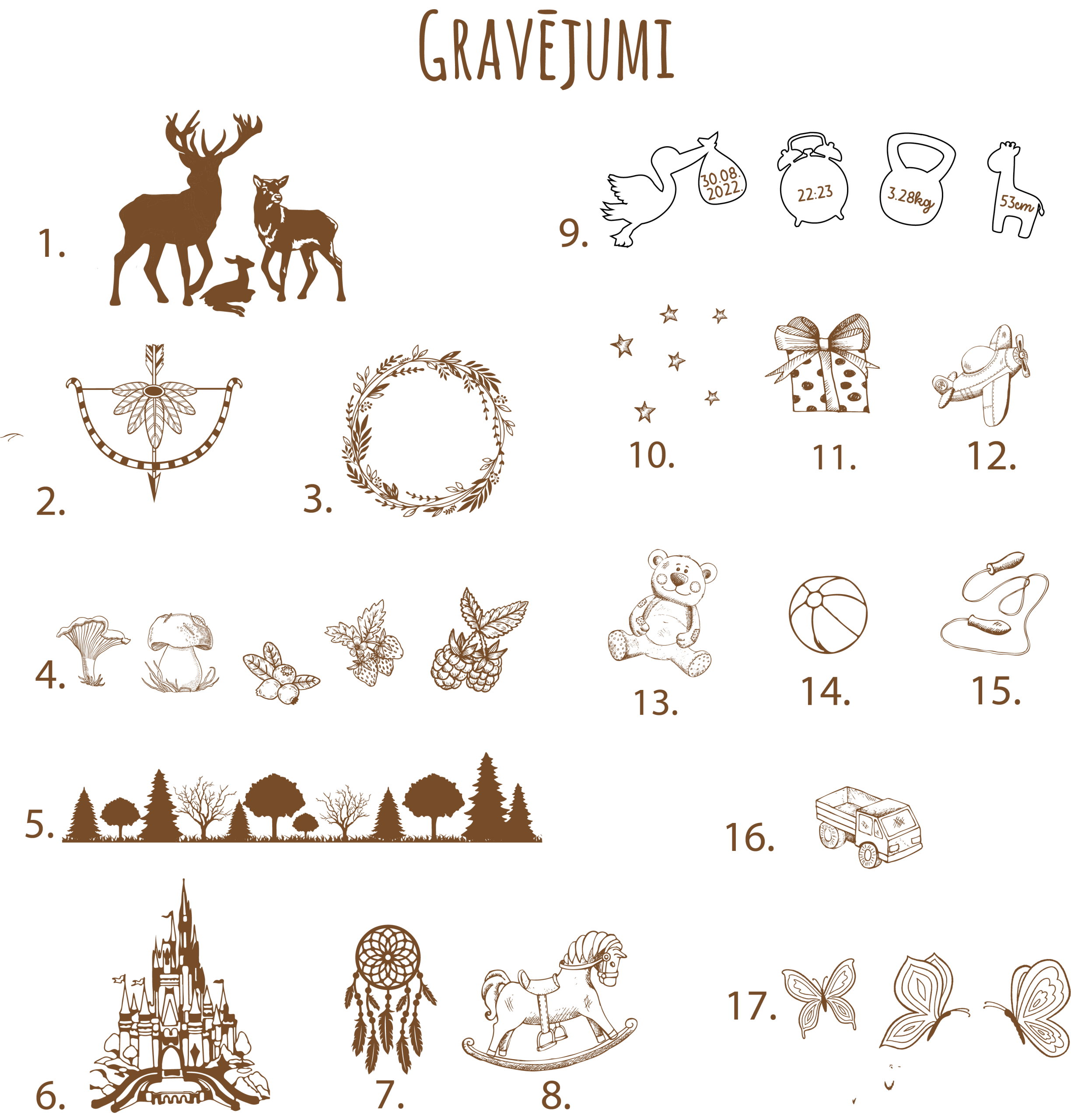 Izvēlies lādes izmēru un pasūtījuma komentāros ieraksti gravējuma numurus, tekstu un fonta numuru. Pirms ražošanas nosūtīsim skici apstiprināšanai.